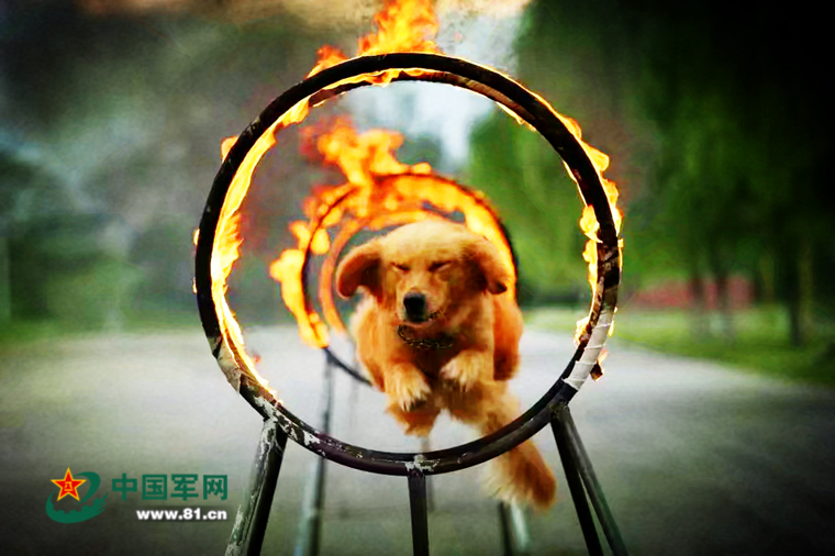 身為軍犬,金山同軍人無二,每天清晨,總會在訓(xùn)練場上看到一人一狗迎著朝陽一起“出操”跑步的身影。而且,有時金山興致來了,主人高涵就得“舍命陪金山”,要跟上它多跑幾圈盡興才能“收操”。不過,凡事都要盡興的金山也有發(fā)怵的時刻。軍犬專業(yè)訓(xùn)練中,它可以沉穩(wěn)完成大多數(shù)課目,唯獨面對障礙中的鉆火圈訓(xùn)練,靈性的金山秒變“狗熊”。它較別的軍犬更懼怕火焰,面對熊熊燃燒的火圈都會在高涵腳旁打轉(zhuǎn),不敢上前。