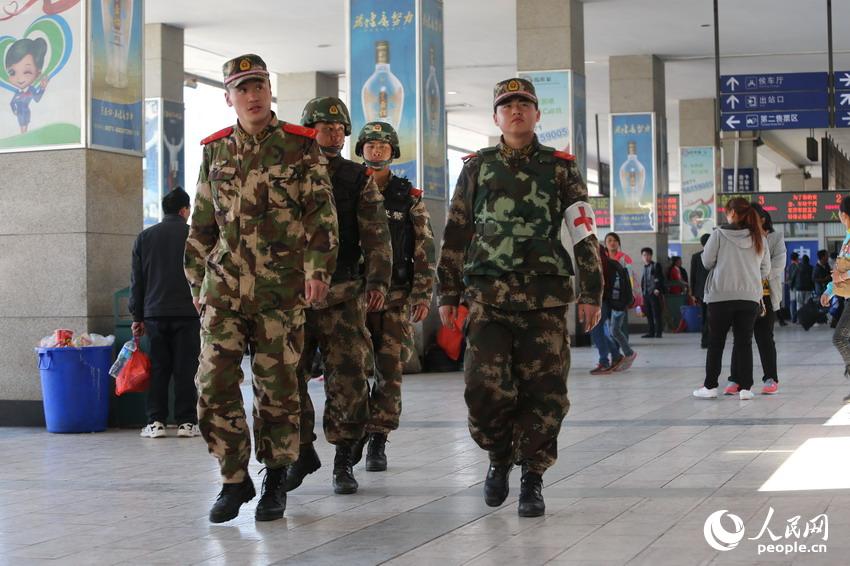 武警持槍在昆明火車站執(zhí)勤