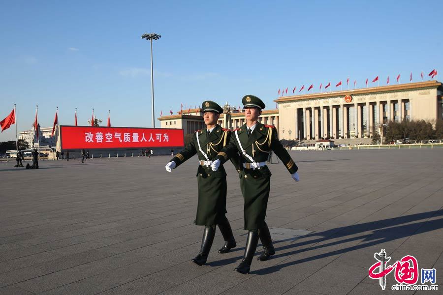 3月5日,武警北京總隊(duì)天安門(mén)支隊(duì)執(zhí)勤戰(zhàn)士執(zhí)勤上哨。 李光印攝影