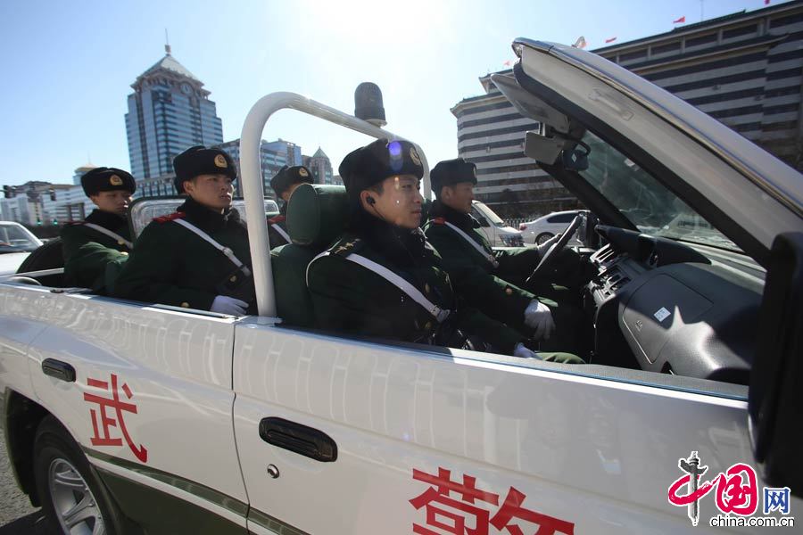 3月4日,武警北京總隊(duì)執(zhí)勤官兵乘敞篷車在長安街武裝巡邏。 李光印攝影