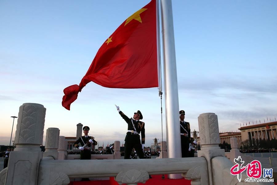 3月5日清晨,武警國旗護(hù)衛(wèi)隊(duì)舉行升旗儀式。李光印攝影
