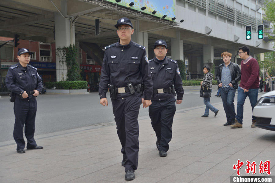 4月20日,上海華陽路派出所民警配槍在街頭巡邏。
