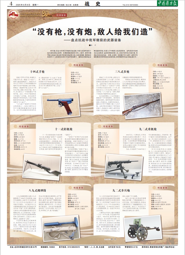 80年前,經(jīng)過14年艱苦卓絕的浴血奮戰(zhàn),中國人民最終取得了抗日戰(zhàn)爭的偉大勝利。在那硝煙彌漫的歲月里,八路軍、新四軍和華南人民抗日游擊隊(duì)等黨領(lǐng)導(dǎo)的武裝力量,在武器簡陋、物資匱乏的條件下,與裝備精良的日軍展開殊死搏斗。他們以頑強(qiáng)的意志和高超的智慧,從敵人手中繳獲大量武器裝備。這些武器不僅成為打擊侵略者、贏得勝利的重要工具,更是中國軍民不屈不撓、英勇抗?fàn)幍臍v史見證。本期,讓我們一同回顧當(dāng)年八路軍、新四軍等部隊(duì)繳獲并使用的部分武器裝備,回望那段烽火連天的抗戰(zhàn)歲月。