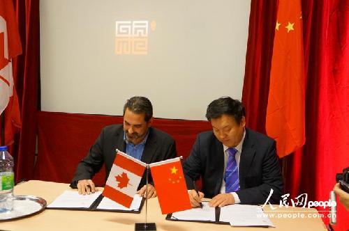 中國(guó)游戲產(chǎn)業(yè)協(xié)會(huì)會(huì)長(zhǎng)張斌同蒙特利爾數(shù)字聯(lián)盟主席達(dá)斯圖簽署戰(zhàn)略合諒解備忘錄。記者 李學(xué)江 攝