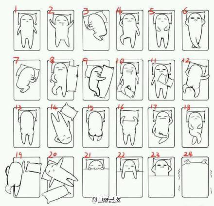 圖上羅列了24種各式各樣的睡姿,有翹二郎腿故作瀟灑的,有張開雙臂“自由飛翔”的,也有頭在床尾、腳在床頭,直接睡移位的。這些“銷魂”的姿勢讓人忍俊不禁,網(wǎng)友紛紛對號入座,尋找自己的睡姿。