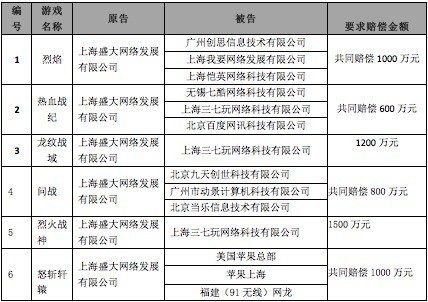 盛大游戲自2013年年末掀起大規(guī)模的《傳奇》維權(quán)戰(zhàn),11月盛大游戲就曾針對百度、37wan等9家公司發(fā)起民事維權(quán)訴訟,指其相關(guān)的5款游戲產(chǎn)品涉嫌侵犯《熱血傳奇》的注冊商標(biāo)專用權(quán)、著作權(quán)并構(gòu)成對盛大的不正當(dāng)競爭等,要求公開致歉,停止運(yùn)營相關(guān)游戲及平臺(tái),并賠償相應(yīng)經(jīng)濟(jì)損失,這五個(gè)案件將于12月底至明年1月份陸續(xù)開庭。