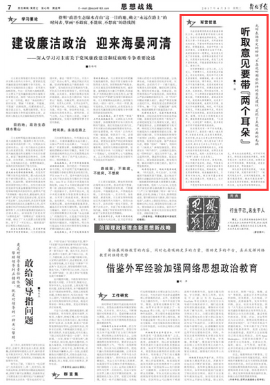 今日《解放軍報》刊登文章《聽取意見要帶“兩個耳朵”》指出,聽取意見不是目的,發(fā)現(xiàn)問題、糾正問題才是目的。即便是那些帶刺的、有點偏激的意見,只要有可取之處,都應(yīng)該盡量合理吸納,用以改進(jìn)工作、完善自己。這才是正確的態(tài)度。