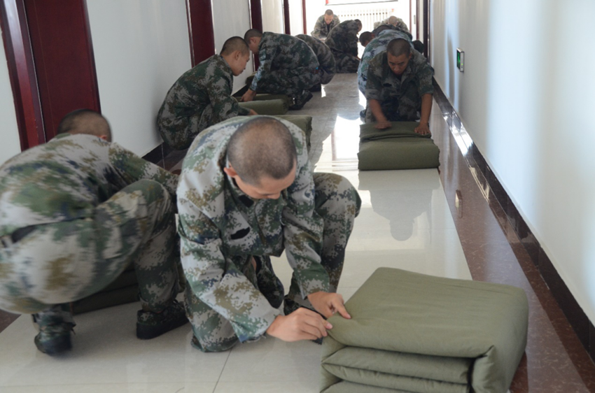 終于接觸到傳說中的軍被了,可是要怎么做才能讓你們變成“豆腐塊”呢。在班排長的幫助下,新兵們互相交流技巧,使出渾身解數,才讓被子有了一些“豆腐”的樣子,可是和班長們的被子比起來。大家的被子只能稱之為“軟豆腐”