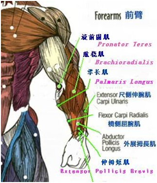 1.淺層:有5塊,從橈側(cè)到尺側(cè)依次為肱橈肌、旋前圓肌、橈側(cè)腕屈肌、掌長(zhǎng)肌、及尺側(cè)腕屈肌。