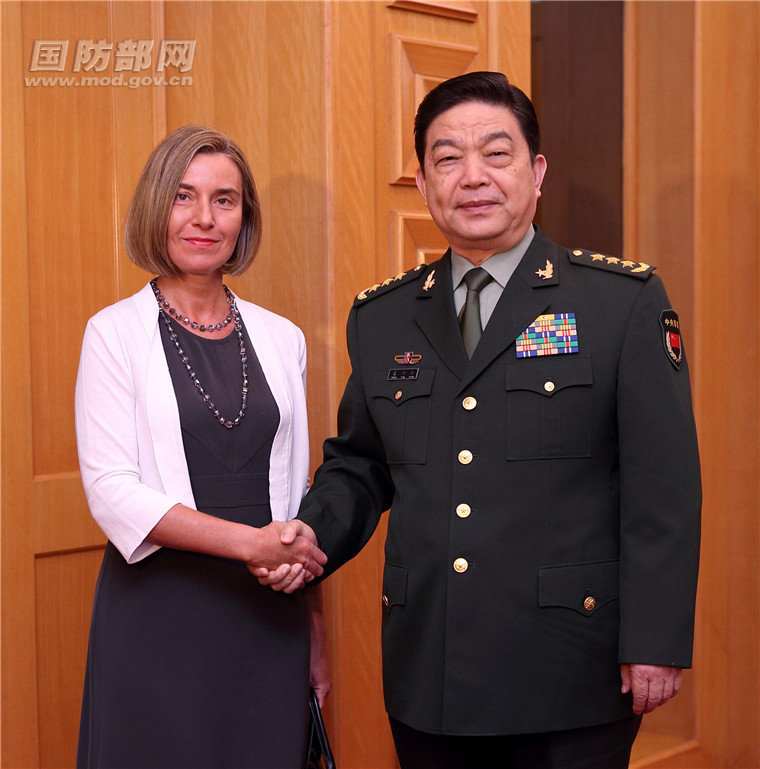4月20日上午,國務委員兼國防部長常萬全在八一大樓會見了來華參加第七次中歐高級別戰(zhàn)略對話的歐盟外交與安全政策高級代表莫蓋里尼。李曉偉 攝