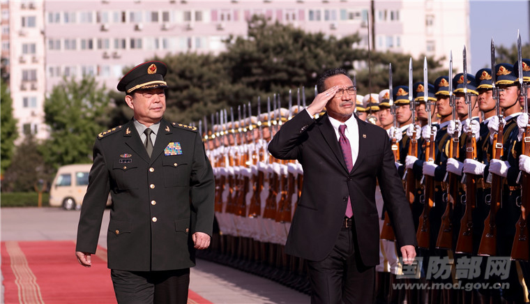 4月21日下午,國務(wù)委員兼國防部長常萬全在八一大樓與來訪的馬來西亞國防部長希沙慕丁舉行會(huì)談。會(huì)談前,常萬全為希沙慕丁舉行歡迎儀式,并陪同檢閱中國人民解放軍三軍儀仗隊(duì)。李曉偉 攝
