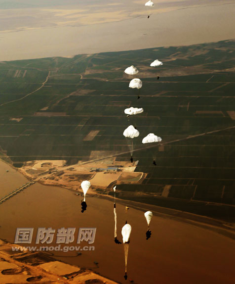 空降兵某部成建制跳傘 黃河上空傘花朵朵