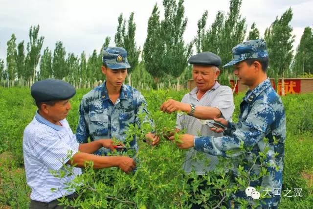 2015年6月19日,西安飛行學(xué)院某旅場(chǎng)站軍需股戰(zhàn)士在向駐地為維吾爾族種植能手學(xué)習(xí)棗樹(shù)嫁接技術(shù),種植的棗樹(shù)不僅果實(shí)掛滿枝頭,還架起了軍民團(tuán)結(jié)的橋梁。李強(qiáng) 攝