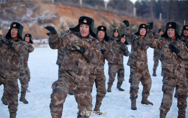 11月28日,黑龍江黑河市,黑龍江省軍區(qū)某邊防團(tuán)40余名“90后”新兵冒著零下27攝氏度的高寒氣溫跑完5公里越野后,一起齊跳小蘋果,娛樂身心,又消除訓(xùn)練疲勞。