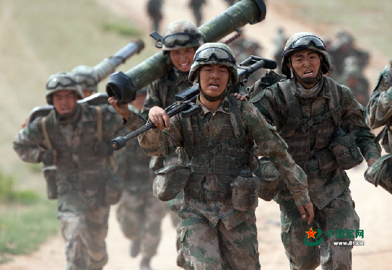 資料圖:記者目擊“跨越-2015·朱日和”系列實兵對抗演習之10公里奔襲,圖為部隊奔襲途中。王佳寅 攝