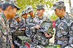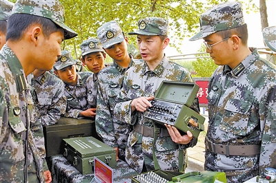 導(dǎo)彈一營(yíng)助理工程師羅德強(qiáng)(右二)向戰(zhàn)友介紹他的小發(fā)明。仇成梁攝