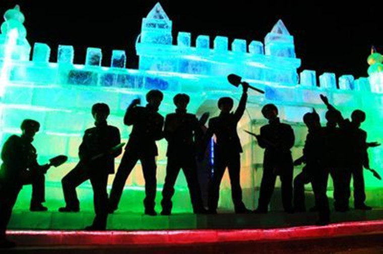 為了做一件上好的冰雕,戰(zhàn)士們必須得提前一個(gè)星期甚至更長(zhǎng)時(shí)間做準(zhǔn)備。首先,戰(zhàn)士們用圖紙把要做的冰雕形狀勾勒出來(lái),然后找些木材,在冰雕展地搭出架子,接下來(lái)就是往架子上澆水。這里溫暖低,澆上的水倒是能夠快速結(jié)冰,但也不能一次做成冰雕。一連數(shù)日,戰(zhàn)士們每天都要往架子上澆水,結(jié)成冰后,再用鏟子、鑿子雕刻成型。