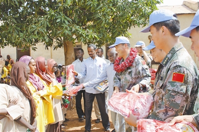 當(dāng)?shù)貢r(shí)間5月29日,中國(guó)第九批赴蘇丹達(dá)爾富爾維和工程兵大隊(duì)官兵給當(dāng)?shù)貎和腿チ斯?jié)日禮物。