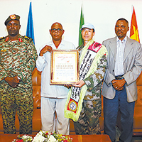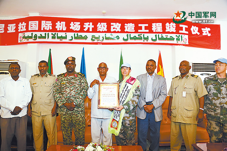 竣工儀式上,尼亞拉國(guó)際機(jī)場(chǎng)官員向中國(guó)第13批赴蘇丹達(dá)爾富爾維和工兵分隊(duì)指揮長(zhǎng)王星(左五)頒發(fā)榮譽(yù)證書。周彥峰 攝