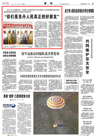 應(yīng)當(dāng)?shù)卣吐?lián)非達(dá)團(tuán)請(qǐng)求,今年1月中旬,剛剛完成部署的中國(guó)第13批赴蘇丹達(dá)爾富爾維和工兵分隊(duì),承擔(dān)了尼亞拉國(guó)際機(jī)場(chǎng)升級(jí)改造任務(wù)。經(jīng)過(guò)131天連續(xù)奮戰(zhàn),施工官兵頂著高溫酷暑,每天早出晚歸,累計(jì)清理場(chǎng)地50余萬(wàn)平方米,修建機(jī)場(chǎng)環(huán)場(chǎng)路12公里,挖掘清理排水溝4500米……南達(dá)爾富爾州州長(zhǎng)阿丹·法基乘機(jī)從空中看到機(jī)場(chǎng)的變化后,專程來(lái)到施工現(xiàn)場(chǎng)向中國(guó)工兵致謝:“感謝你們的不懈努力,你們是蘇丹人民真正的好朋友?!痹敿?xì)報(bào)道請(qǐng)關(guān)注今日出版的《解放軍報(bào)》——