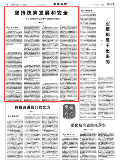 發(fā)展和安全要同步推進。一個國家的發(fā)展和安全,相輔相成、不可偏廢,相依而生、存亡與共。這要求我們必須把國家安全貫穿到黨和國家工作各方面全過程,同經(jīng)濟社會發(fā)展一起謀劃、一起部署,做到協(xié)調(diào)一致、齊頭并進。在新時代統(tǒng)攬偉大斗爭、偉大工程、偉大事業(yè)、偉大夢想的實踐中,以習近平同志為核心的黨中央站在戰(zhàn)略和全局的高度,深刻揭示了“發(fā)展和安全要同步推進”的客觀規(guī)律,明確“統(tǒng)籌發(fā)展和安全,增強憂患意識,做到居安思危,是我們黨治國理政的一個重大原則”,并在“發(fā)展”前增加了“更為安全”的要求,即必須“實現(xiàn)更高質(zhì)量、更有效率、更加公平、更可持續(xù)、更為安全的發(fā)展”。在前進道路上,我們既要善于運用發(fā)展成果夯實國家安全的實力基礎(chǔ),又要善于塑造有利于經(jīng)濟社會發(fā)展的安全環(huán)境,實現(xiàn)發(fā)展和安全互為條件、彼此支撐。