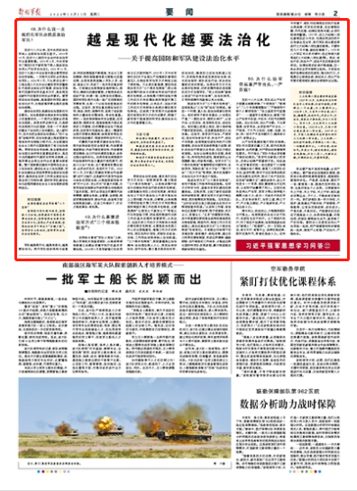 黨的十八大以來,黨中央把依法治軍納入全面依法治國總盤子。2014年10月,黨的十八屆四中全會對依法治軍作出重要部署。2015年2月,中央軍委專門制定《關(guān)于新形勢下深入推進(jìn)依法治軍從嚴(yán)治軍的決定》。2021年11月,黨的十九屆六中全會首次提出要貫徹依法治軍戰(zhàn)略。一支現(xiàn)代化軍隊(duì)必然是法治軍隊(duì)。2022年3月,習(xí)主席在出席十三屆全國人大五次會議解放軍和武警部隊(duì)代表團(tuán)全體會議時(shí)強(qiáng)調(diào),依法治軍是我們黨建軍治軍的基本方式,是實(shí)現(xiàn)黨在新時(shí)代的強(qiáng)軍目標(biāo)的必然要求。要貫徹依法治軍戰(zhàn)略,提高國防和軍隊(duì)建設(shè)法治化水平,為推進(jìn)強(qiáng)軍事業(yè)提供堅(jiān)強(qiáng)法治保障。
