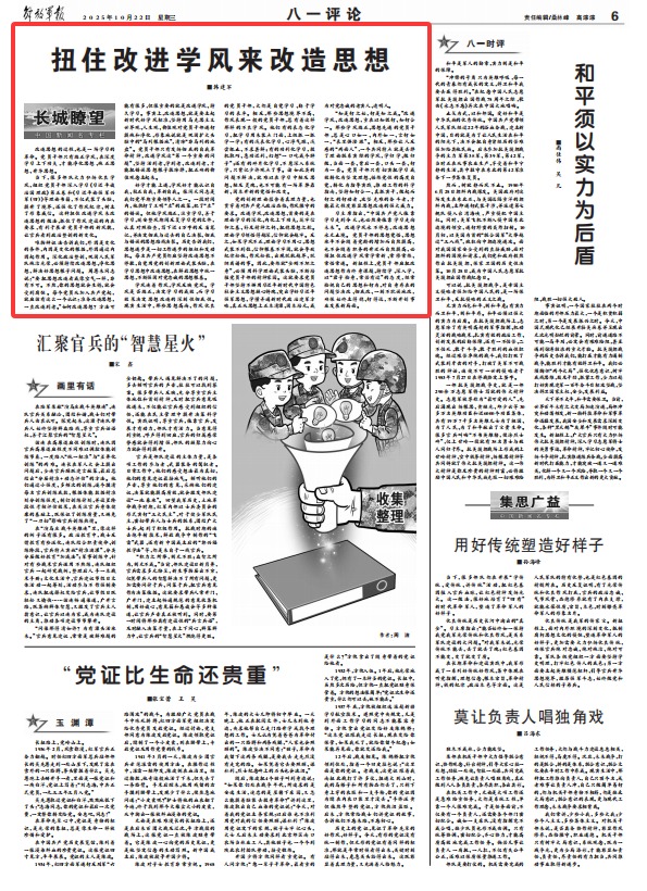 當(dāng)下,很多部隊(duì)大力弘揚(yáng)優(yōu)良學(xué)風(fēng),組織黨員干部深入學(xué)習(xí)《習(xí)近平談治國(guó)理政》第五卷和《習(xí)近平論強(qiáng)軍興軍(四)》等理論書籍,不僅武裝了頭腦、提升了境界,還強(qiáng)化了作風(fēng)紀(jì)律、樹立了形象威信。這種扭住改進(jìn)學(xué)風(fēng)來(lái)改造思想的做法,抓住了作風(fēng)建設(shè)的內(nèi)在要求,有利于展示黨員干部的新風(fēng)貌,讓官兵看到政治整訓(xùn)的新變化。