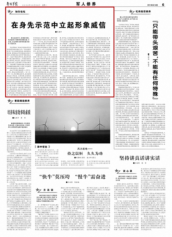 政治干部肩負(fù)著教育人、引導(dǎo)人、培養(yǎng)人、塑造人的職責(zé)使命,一言一行、一舉一動(dòng),官兵都看在眼里,會(huì)直接影響政治工作成效。紅軍時(shí)期,當(dāng)時(shí)的政治工作條例明確規(guī)定“政治指導(dǎo)員不論在執(zhí)行自己的職務(wù)上和個(gè)人行動(dòng)上,均須做全體軍人的模范”;新中國(guó)成立后的第一部《中國(guó)人民解放軍政治工作條例總則(草案)》,同樣要求一切政治工作人員“在完成一切任務(wù)中起模范作用”;奮進(jìn)新時(shí)代,古田全軍政治工作會(huì)議將“堅(jiān)持黨員干部帶頭、以身作則”作為我軍政治工作優(yōu)良傳統(tǒng)之一總結(jié)提出,中央軍委政治工作會(huì)議要求“恢復(fù)和弘揚(yáng)政治工作優(yōu)良傳統(tǒng)”,強(qiáng)調(diào)“各級(jí)特別是高級(jí)干部要以身作則、率先垂范”……可以說(shuō),身先示范是我黨我軍的優(yōu)良傳統(tǒng),我黨我軍對(duì)各級(jí)政治干部身先示范的要求是一以貫之的。新征程上重塑自身形象威信,需要廣大政治干部在學(xué)習(xí)、工作、生活等各方面嚴(yán)于律己、表率在先,做到言行一致、表里如一,贏得官兵尊重和信賴。