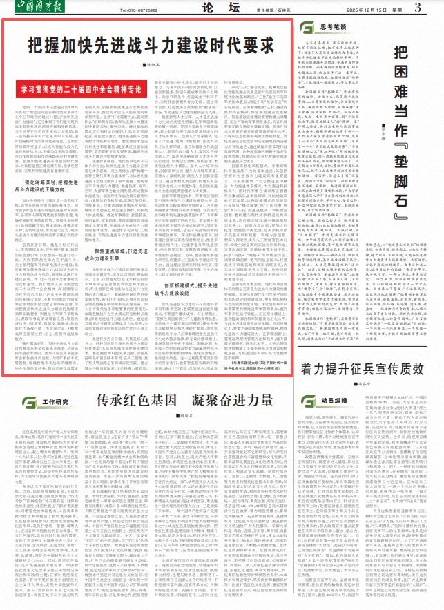 堅(jiān)持思想引領(lǐng)。越是目標(biāo)宏偉遠(yuǎn)大、形勢錯(cuò)綜復(fù)雜、任務(wù)艱巨繁重,越要加強(qiáng)思想引領(lǐng),以思想統(tǒng)一促進(jìn)行動(dòng)一致。人民軍隊(duì)的生命力在于戰(zhàn)斗力。習(xí)主席用強(qiáng)軍目標(biāo)審視戰(zhàn)斗力建設(shè),高度重視發(fā)展先進(jìn)戰(zhàn)斗力,以加快先進(jìn)戰(zhàn)斗力有效供給為指向,領(lǐng)導(dǎo)推動(dòng)現(xiàn)代化建設(shè)各項(xiàng)工作,讓一切戰(zhàn)斗力要素的活力競相迸發(fā)。我們要深入學(xué)習(xí)領(lǐng)會(huì)黨的二十屆四中全會(huì)精神,深刻領(lǐng)悟以習(xí)近平同志為核心的黨中央建設(shè)鞏固國防和強(qiáng)大軍隊(duì)、不斷開創(chuàng)新時(shí)代強(qiáng)軍事業(yè)新局面的堅(jiān)定意志和深謀遠(yuǎn)慮,深刻把握加快先進(jìn)戰(zhàn)斗力建設(shè)的戰(zhàn)略謀劃和實(shí)踐要求,積極搶占軍事斗爭制高點(diǎn),謀取軍事競爭發(fā)展新優(yōu)勢,聚焦先進(jìn)戰(zhàn)斗力思變革、抓建設(shè)、做準(zhǔn)備,推動(dòng)新時(shí)代備戰(zhàn)打仗工作走深走實(shí),不斷提高捍衛(wèi)國家主權(quán)、安全、發(fā)展利益戰(zhàn)略能力。