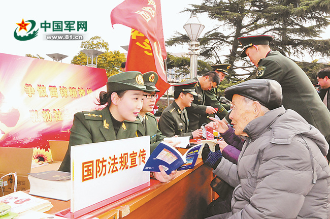 ??? 江蘇省太倉市人武部經(jīng)常性地組織干部職工走上街頭,開展全民國防教育活動。圖為3月11日,該人武部干部在人員稠密的城區(qū)廣場設(shè)立國防法規(guī)宣傳站,給市民解讀相關(guān)國防法規(guī)。莊明霞攝