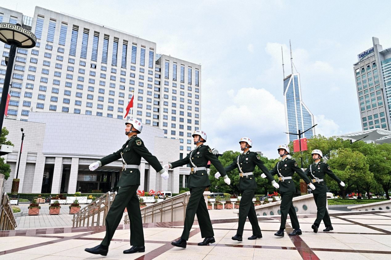 上海警備區(qū)警備糾察隊(duì)一中隊(duì)糾察小分隊(duì)正在上海人民廣場巡邏執(zhí)勤。