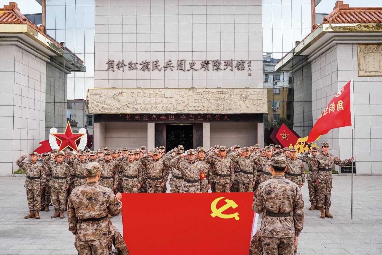 角斜“紅旗民兵團(tuán)”組織黨員民兵到該民兵團(tuán)史績陳列館開展主題黨日活動。(攝影/張志榮)