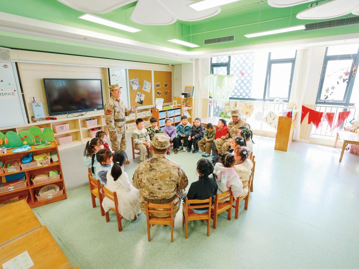 角斜“紅旗民兵團(tuán)”組織民兵走進(jìn)學(xué)校開展國防教育。(攝影/許海波)