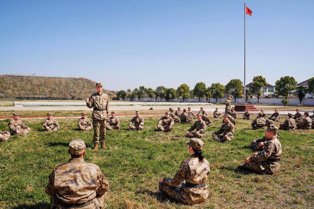 角斜“紅旗民兵團(tuán)”利用訓(xùn)練間隙組織民兵開展隨機(jī)教育。(攝影/張 劍)