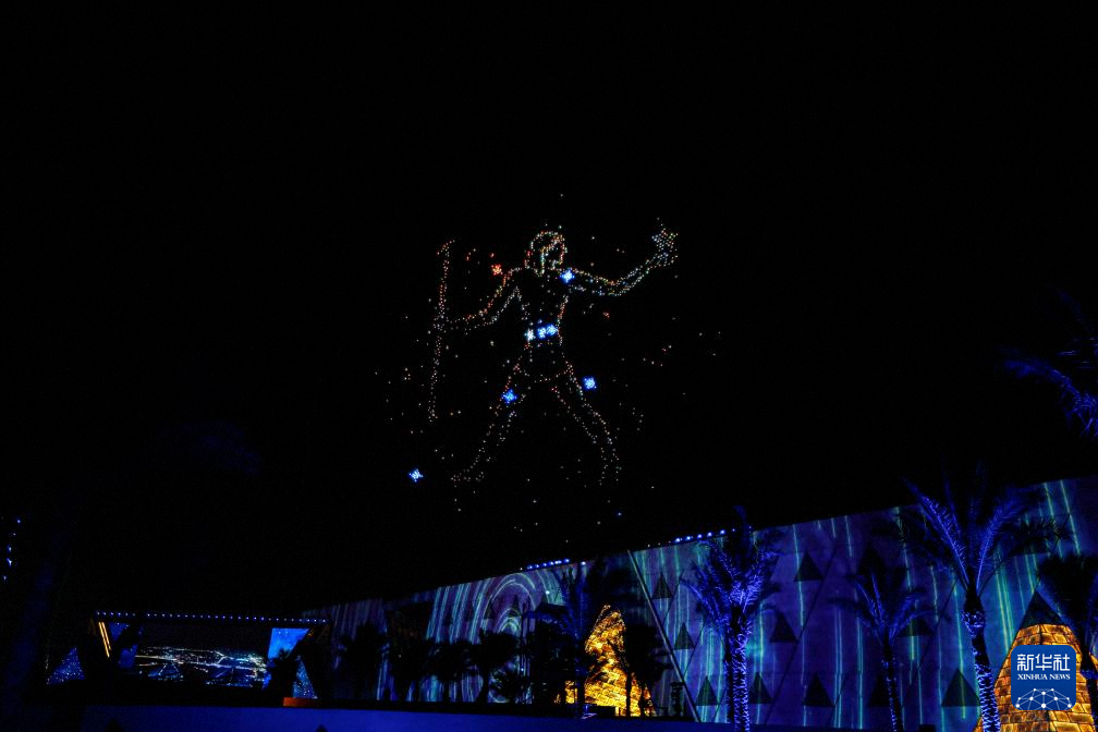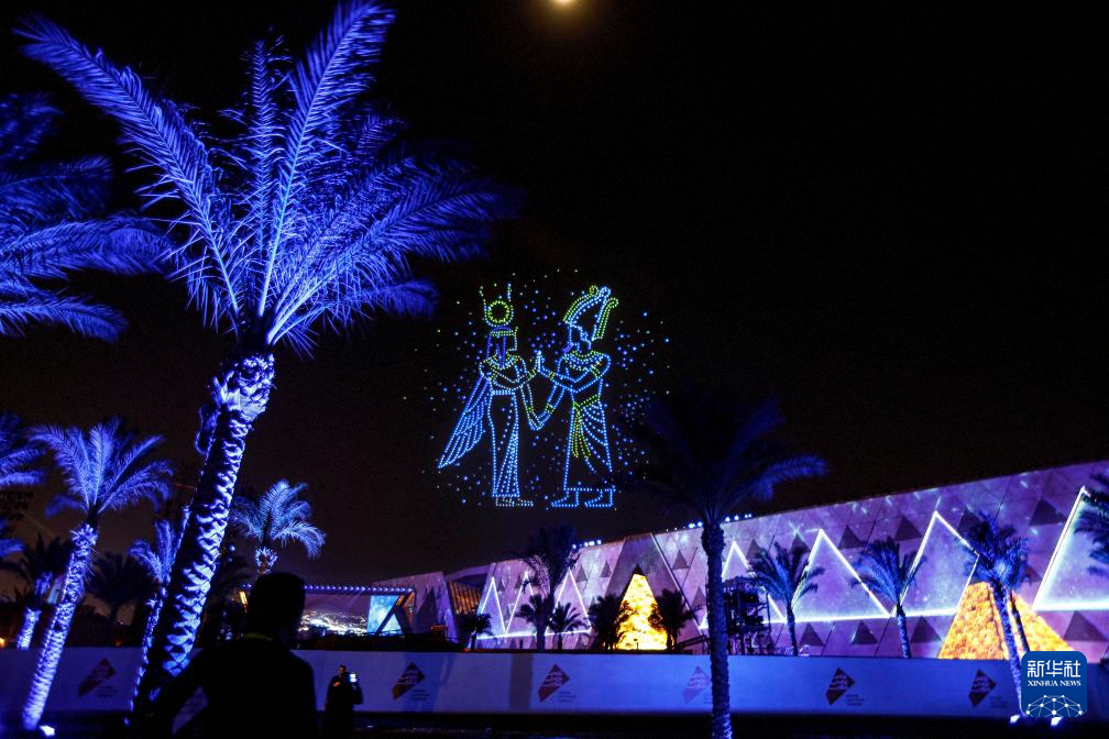 這是11月1日在埃及吉薩拍攝的開館儀式上的無人機表演和燈光秀。新華社發(fā)(艾哈邁德·戈馬攝)