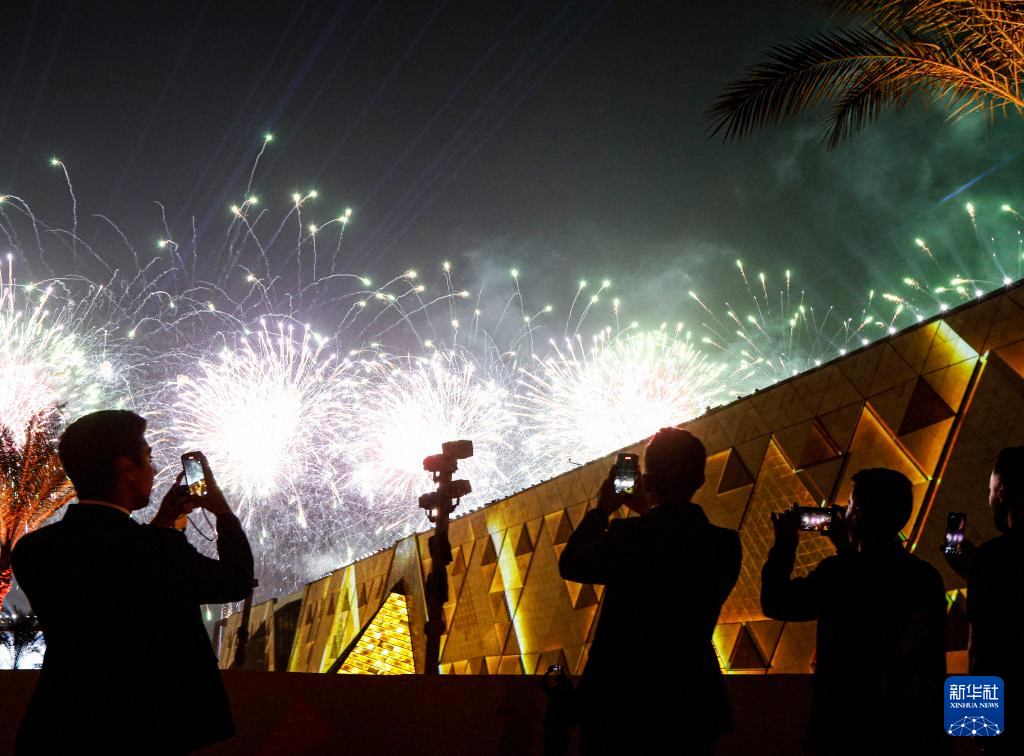 11月1日,人們在埃及吉薩舉行的開館儀式上拍攝煙花和燈光秀表演。新華社發(fā)(艾哈邁德·戈馬攝)