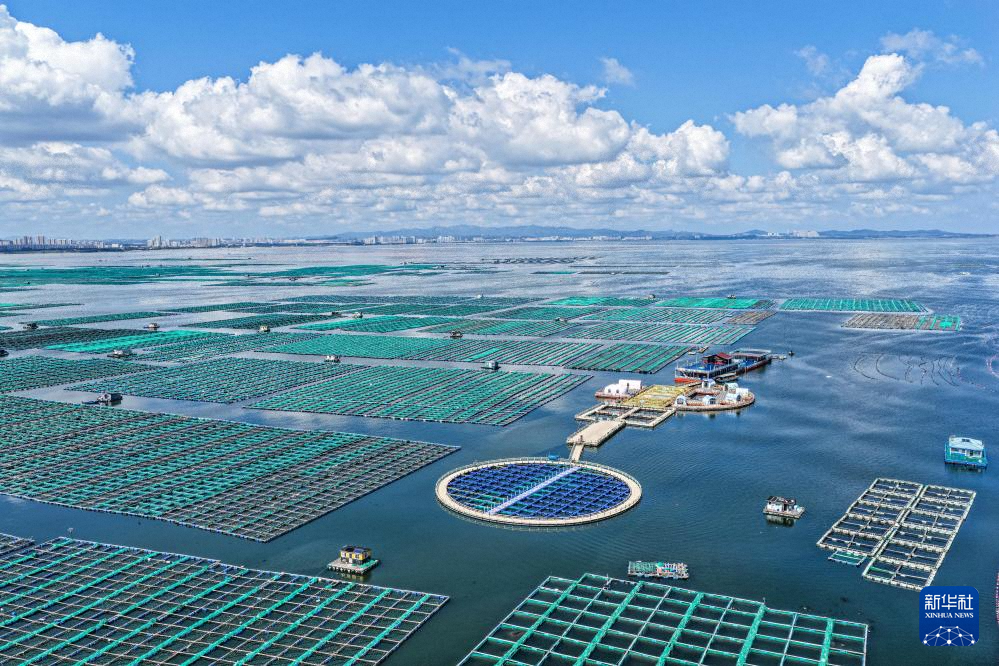 山東省榮成市桑溝灣海洋牧場生態(tài)網(wǎng)箱養(yǎng)殖區(qū)(9月13日攝,無人機照片)。新華社發(fā)(李信君 攝)