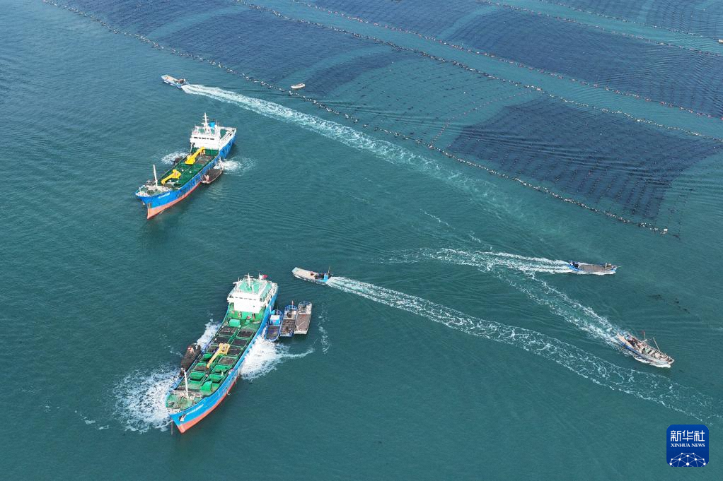 11月11日,在山東省榮成市愛倫灣海洋牧場,運鮮船在裝運鮑魚南下福建越冬(無人機照片)。新華社發(fā)(王福東 攝)