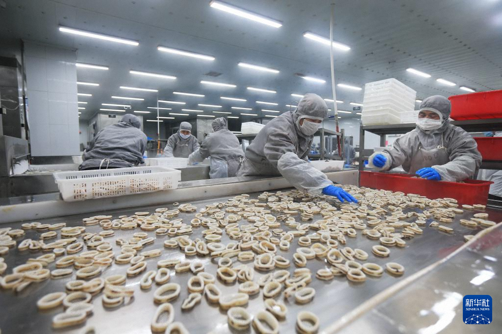 11月10日,山東省榮成市一家海洋食品加工企業(yè)的工人在加工魷魚產(chǎn)品。新華社發(fā)(王福東 攝)