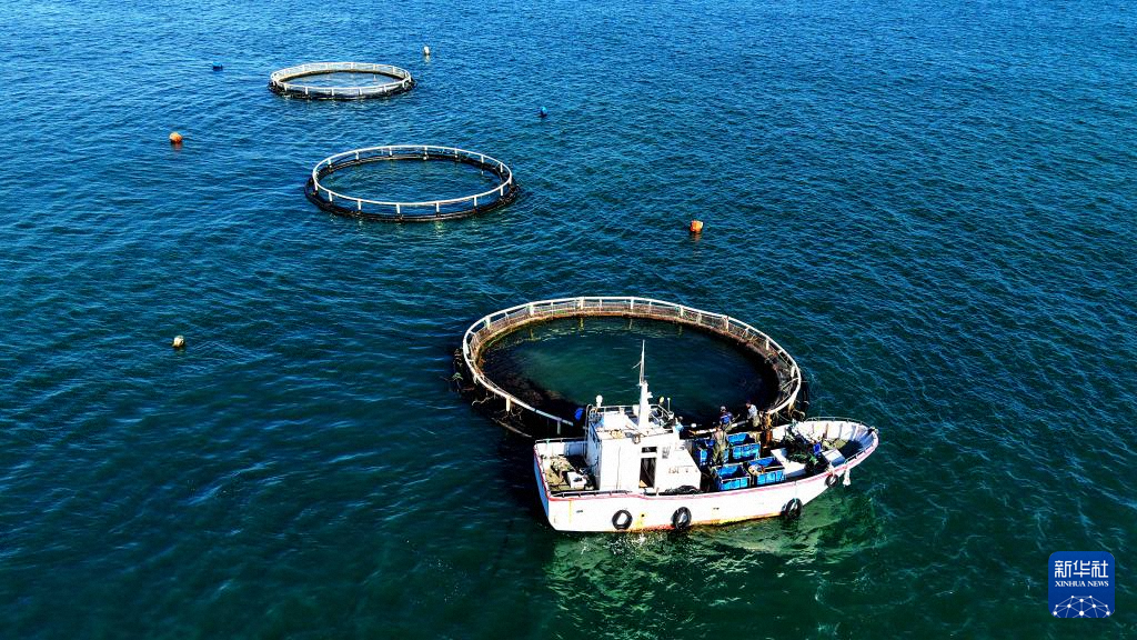 11月10日,在山東青島西海岸新區(qū)魯海豐海洋牧場,養(yǎng)殖船在管護網(wǎng)箱(無人機照片)。新華社發(fā)(俞方平 攝)