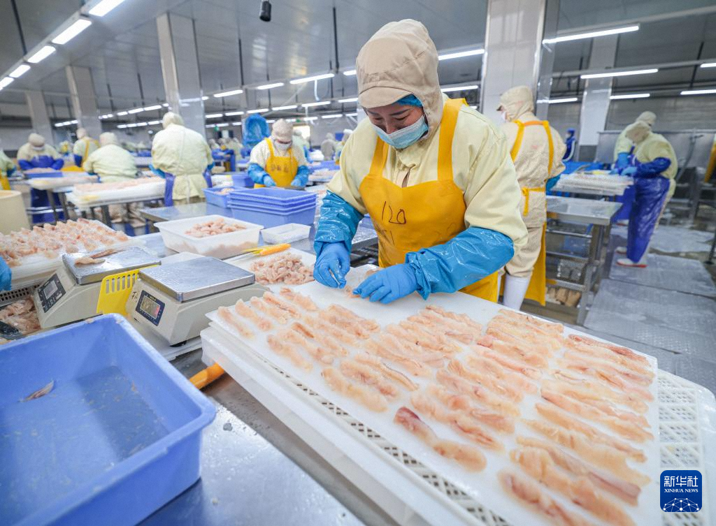 11月10日,山東省榮成市俚島鎮(zhèn)一家水產(chǎn)品加工企業(yè)的工人在加工鱈魚制品。新華社發(fā)(李信君 攝)