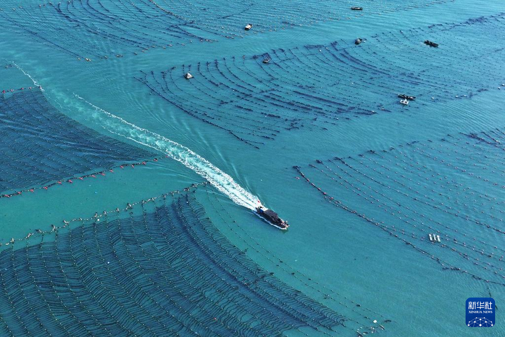 11月10日,在山東省榮成市桑溝灣海洋牧場,養(yǎng)殖工人在養(yǎng)殖區(qū)穿梭作業(yè)(無人機照片)。新華社發(fā)(王福東 攝)