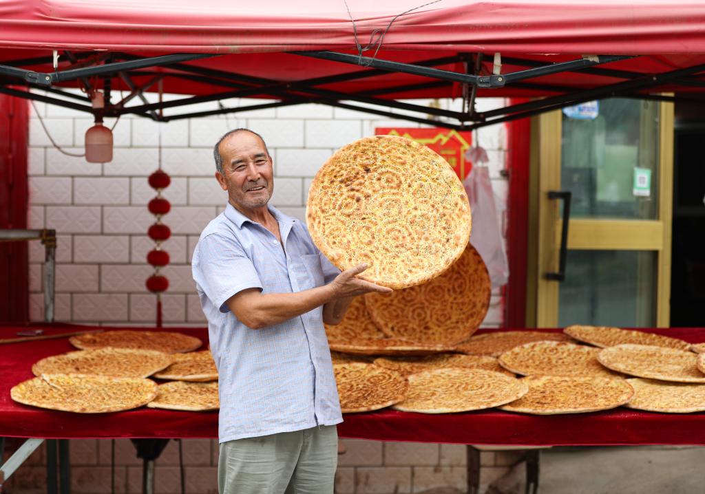 2025年7月21日,在新疆庫車市,傳統(tǒng)面食制作技藝(馕制作技藝)國家級非遺代表性傳承人熱西提展示他制作的馕。新華社記者 王婧嬙 攝