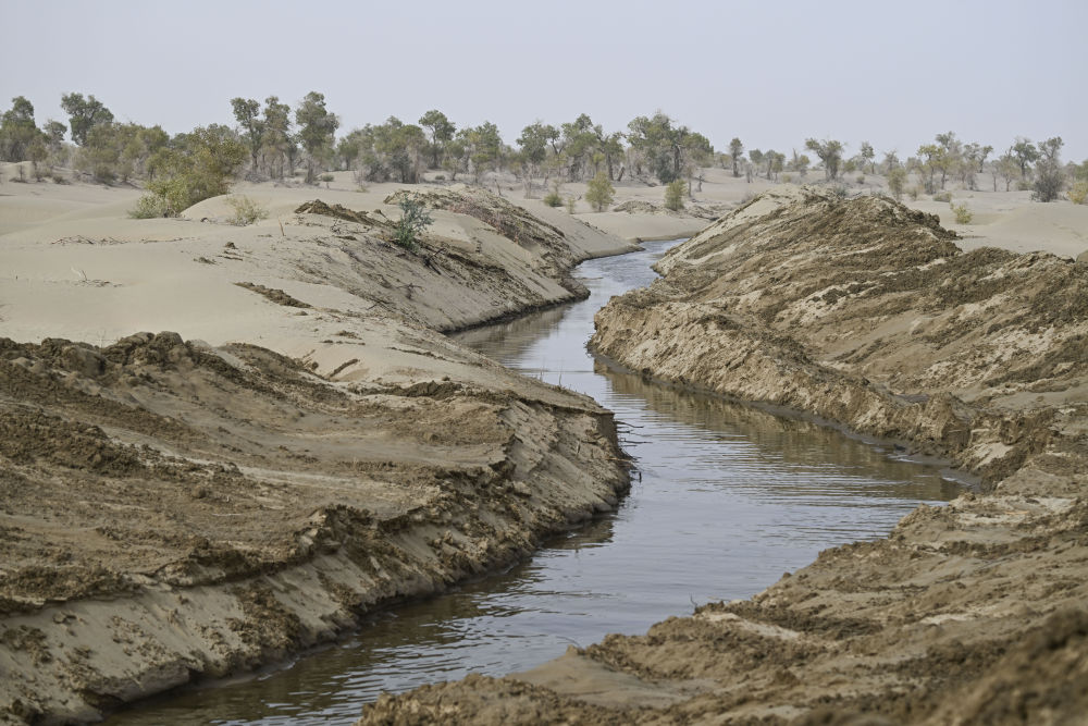 2025年9月19日在新疆巴音郭楞蒙古自治州尉犁縣境內(nèi)的塔克拉瑪干沙漠拍攝的人工挖掘的引洪補水生態(tài)渠。新華社記者 王菲 攝