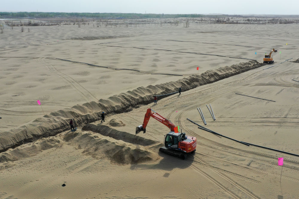 在新疆和田地區(qū)民豐縣防沙治沙試驗站,施工人員駕駛機械預(yù)埋輸水管線(2025年4月8日攝,無人機照片)。新華社記者 丁磊 攝