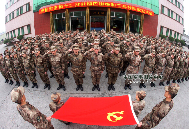 資料圖:第十二批選派赴黎巴嫩維和工兵分隊(duì)出征前向黨旗宣示。