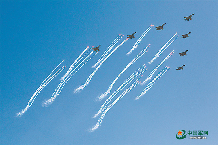 2017年7月30日上午,慶祝中國人民解放軍建軍90周年閱兵在朱日和聯(lián)合訓(xùn)練基地隆重舉行。殲擊機(jī)梯隊(duì)接受檢閱。中國軍網(wǎng)特約記者 劉應(yīng)華 攝