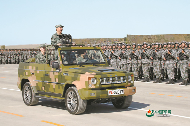 2017年7月30日上午,慶祝中國人民解放軍建軍90周年閱兵在朱日和聯(lián)合訓(xùn)練基地隆重舉行。中共中央總書記、國家主席、中央軍委主席習(xí)近平檢閱部隊(duì)并發(fā)表重要講話。這是習(xí)近平乘車檢閱部隊(duì)。中國軍網(wǎng)記者 周朝榮 攝
