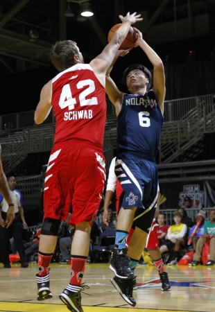 2月16日,中國(guó)特奧運(yùn)動(dòng)員陳小山(右)在比賽中投籃。當(dāng)日,作為2014NBA全明星周末的一部分,一場(chǎng)特殊奧林匹克籃球賽在新奧爾良市舉行。來(lái)自世界各地的20多名特奧運(yùn)動(dòng)員同NBA退役球星編隊(duì)比賽。中國(guó)特奧運(yùn)動(dòng)員陳小山作為代表參加了比賽。