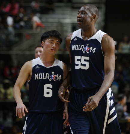 2月16日,中國特奧運動員陳小山(右)在比賽中投籃。當日,作為2014NBA全明星周末的一部分,一場特殊奧林匹克籃球賽在新奧爾良市舉行。來自世界各地的20多名特奧運動員同NBA退役球星編隊比賽。中國特奧運動員陳小山作為代表參加了比賽。